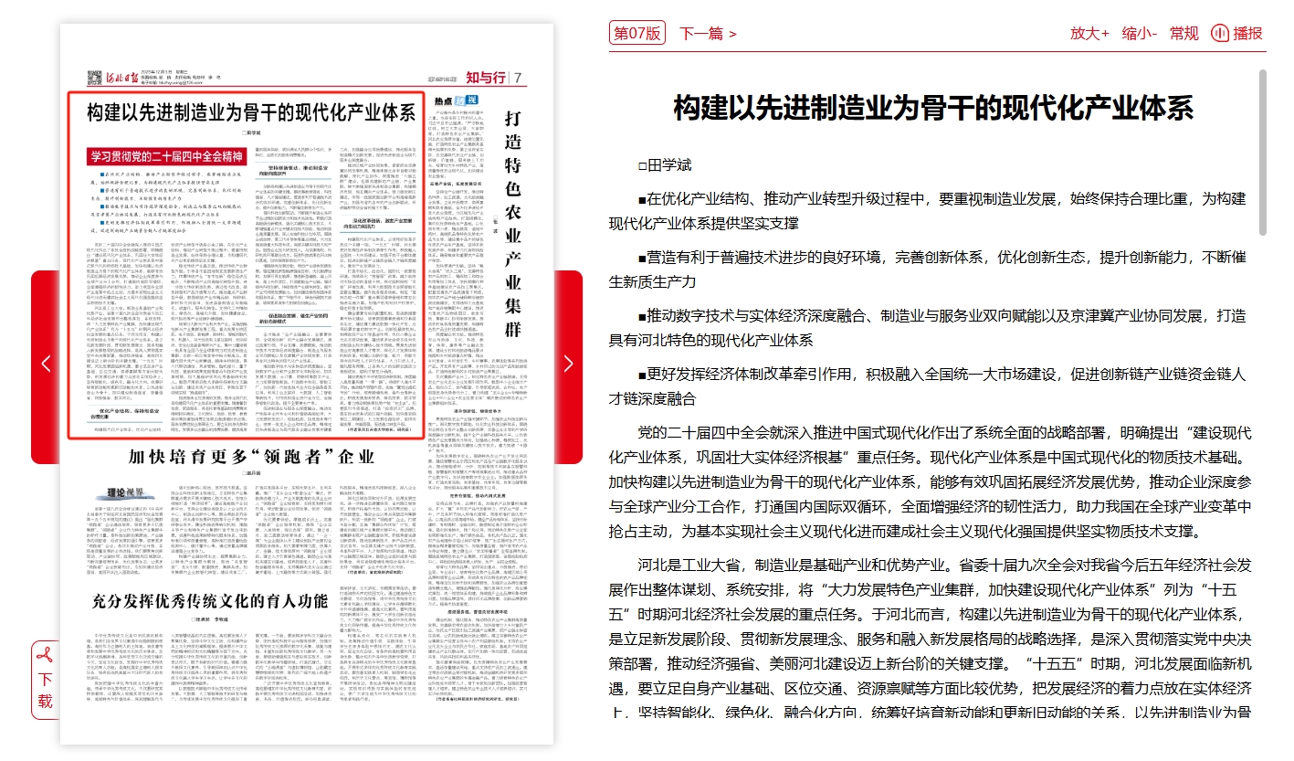 为深入学习贯彻党的二十届四中全会精神,12月3日,我校党委副书记、校长田学斌应邀在《河北日报》“知与行”理论版头条发表题为《构建以先进制造业为骨干的现代化产业体系》的理论研究阐释文章。