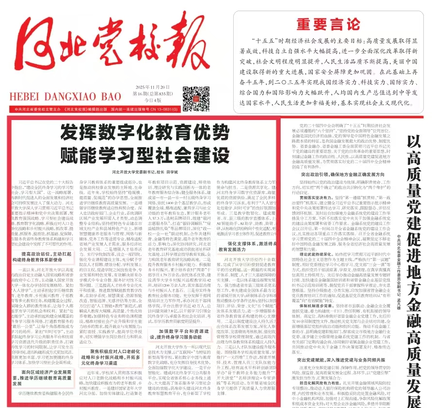 近日,我校党委副书记、校长田学斌应邀在《河北党校报》头版发表题为《发挥数字化教育优势 赋能学习型社会建设》的理论研究阐释文章。