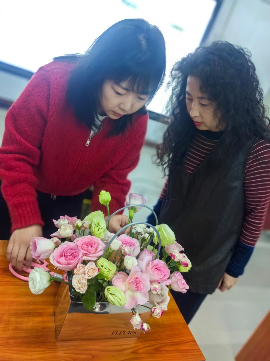 走进插花班教室,任课老师从“主枝定高度、副枝补层次、配花添灵动”的基础原理讲起,一边演示修剪技巧,一边提醒学员注意事项,大家不时互相交流搭配思路。