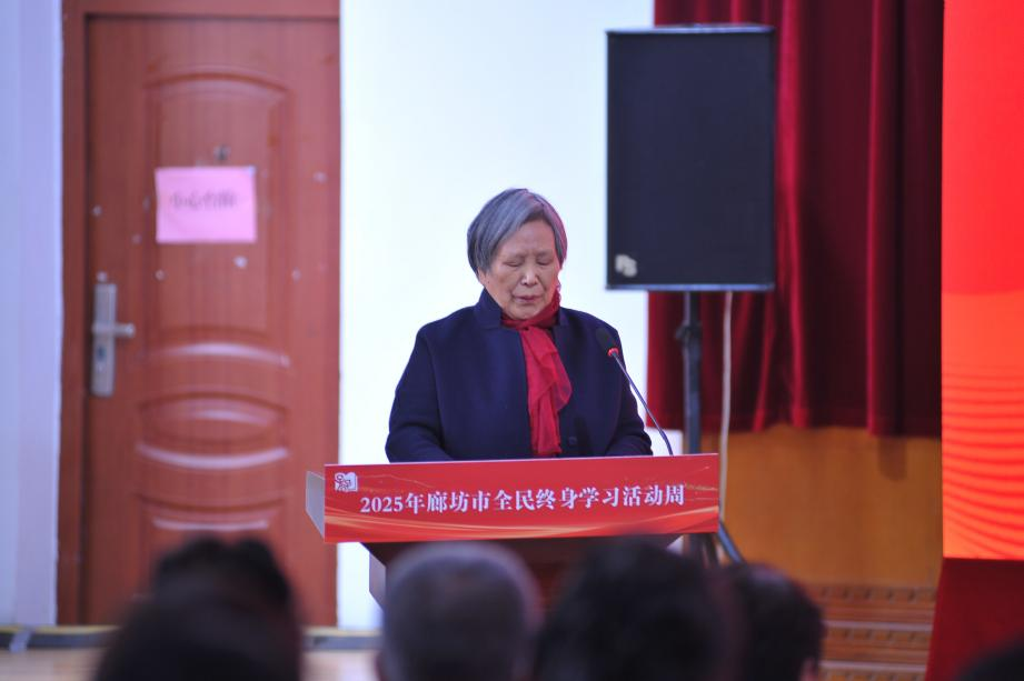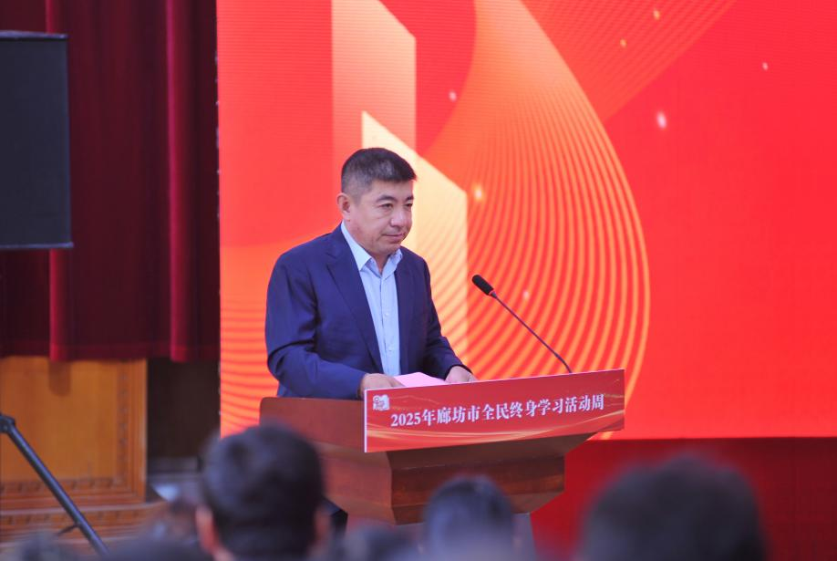 廊坊市委教育工委书记、市教育局党组书记李宏疆讲话并宣布活动周正式启动。李宏疆在讲话中指出,本次活动是贯彻落实习近平总书记关于“建设全民终身学习的学习型社会、学习型大国”重要指示的具体行动。近年来,廊坊全民终身学习工作取得了长足进步,初步建成了辐射市、县、乡、村的四级终身教育网络,让每一位市民都能在家门口找到学习的场所、享受学习的乐趣。他强调,各有关部门要进一步优化人人皆学、处处能学、时时可学的服务机制,深入开展社区教育和老年教育工作,持续推进全民终身学习。一是各有关部门要密切配合,充分发挥各领域的资源优势,全面推进全民终身学习体系的建设。二是要大力构建形式灵活、资源丰富、学习便捷的终身学习体系,积极扩大全民终身学习的资源。三是要组织办好县级全民终身学习活动周,积极开展主题突出、特色鲜明、形式多样、内容丰富的学习活动,扎实推进全民终身学习活动落地见效。