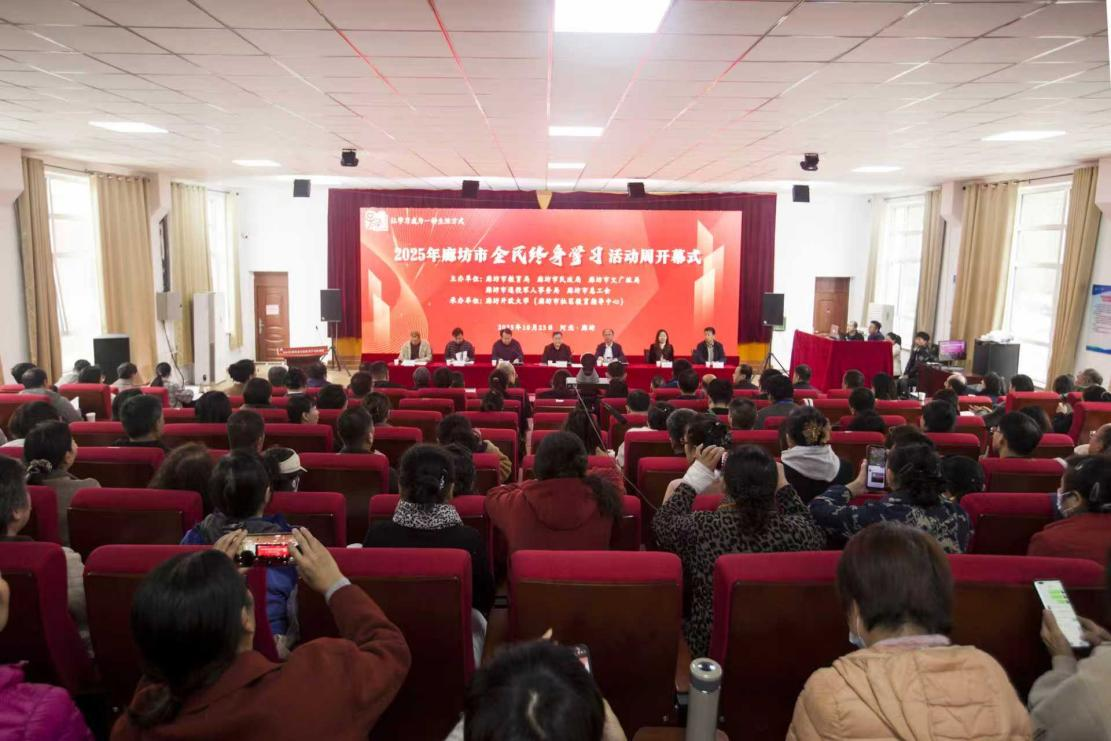 10月23日上午,2025年廊坊市全民终身学习活动周开幕式在廊坊开放大学举行。本次开幕式由廊坊市教育局、市民政局、市文广旅局、市退役军人事务局、市总工会主办,廊坊开放大学承办。廊坊市委教育工委书记、市教育局党组书记李宏疆,廊坊开放大学党委书记马利国,廊坊市文广旅局党组成员、副局长何梦凡,廊坊市退役军人事务局党组成员、副局长石宝智,廊坊市总工会党组成员、副主席靳力强,廊坊市民政局老龄科科长张殿榜等有关单位负责同志出席开幕式。廊坊开放大学领导班子以及各县(市)教体局、民政局、文广旅局、退役军人事务局、开放大学、市属高职院校、市老年大学有关负责同志,“百姓学习之星”代表、社区教育、老年教育学员近200人参加开幕式。