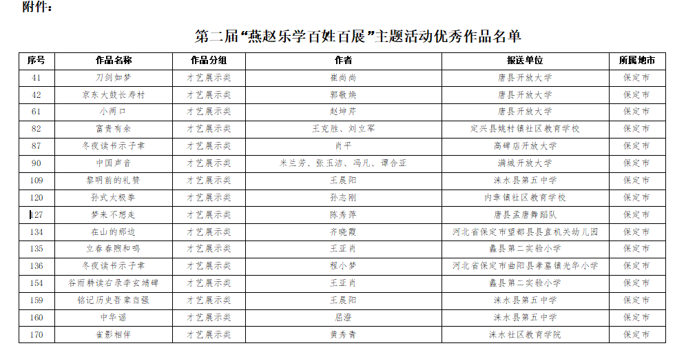 近日,河北省教育厅公布了第二届“燕赵乐学 百姓百展”主题活动的获奖名单,保定开放大学申报的134个作品荣获奖项。此次活动经过各级社区教育指导中心审核推荐,由省社区教育指导中心组织专家开展严格评审,最终评选出各类优秀作品共计1071个。此次获奖是本校参与该活动以来所取得的最优成绩,134个作品获奖是对本校在终身教育领域工作的高度认可,更是本校深耕社区教育、老年教育,践行“以学促乐、以展赋能”理念的鲜活体现。