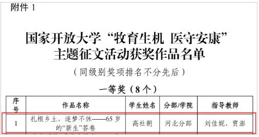 近日,由国家开放大学主办的“牧育生机 医守安康”主题征文活动获奖结果揭晓。邢台开放大学选送的作品《扎根乡土,逐梦不休——65岁的“新生”答卷》凭借扎实的内容与深刻的立意在全国18个分部的134份优秀作品中脱颖而出,荣获一等奖,指导教师刘佳妮等获“优秀指导教师”称号。