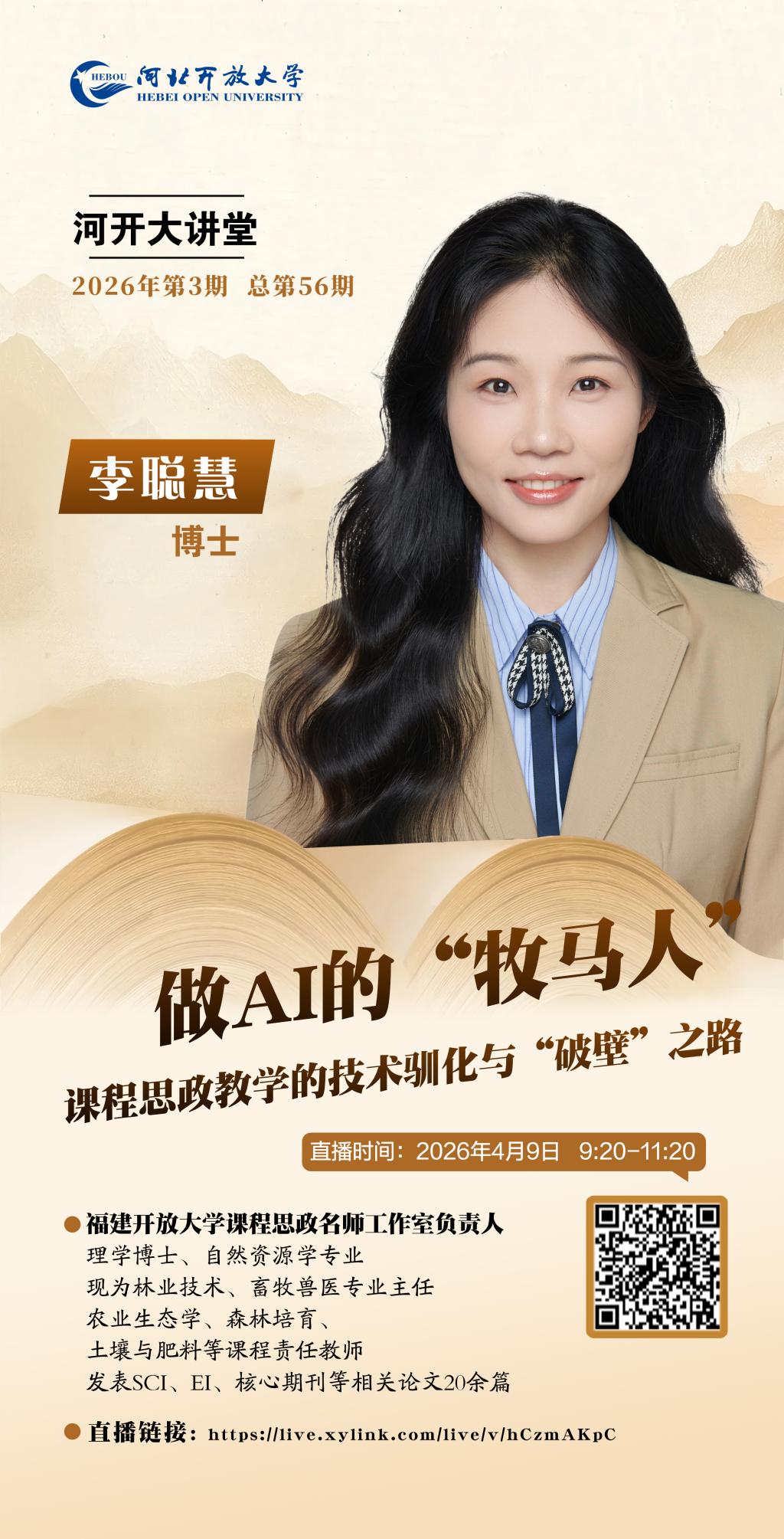 主讲人:李聪慧,理学博士,福建开放大学课程思政名师工作室负责人,自然资源学专业,现为林业技术、畜牧兽医专业主任,农业生态学、森林培育、土壤与肥料等课程责任教师,发表SCI、EI、核心期刊等相关论文20余篇。