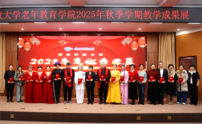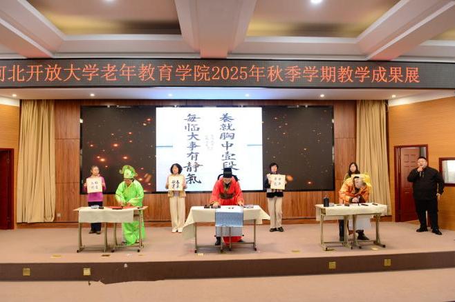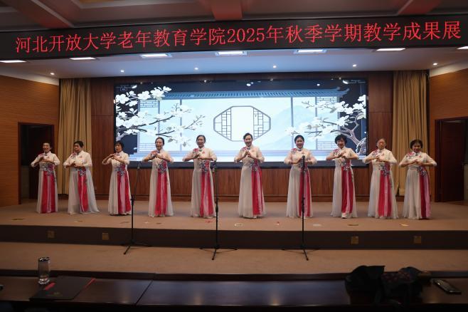 2025年12月30日下午,河北开放大学老年教育学院2025年秋季学期教学成果展演在热烈而温馨的氛围中隆重举行。来自校本部及各教学点的老年学员齐聚一堂,以19个精彩纷呈的文艺节目和百余件原创书画作品,全面展示本学期的教学成效,生动呈现新时代老年教育高质量发展的蓬勃图景。