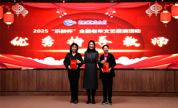 值得一提的是,在2025年“乐龄杯”全国老年文艺展演中,我校选送的京剧节目《梨花颂》凭借出色的编排与精湛的表演,成功入围全国总展演,并荣获“最佳风采节目奖”,两位指导教师获评“优秀指导教师奖”。活动现场,院长王丽娟为获奖教师颁发荣誉证书,充分肯定其在推动老年艺术教育发展中的突出贡献。