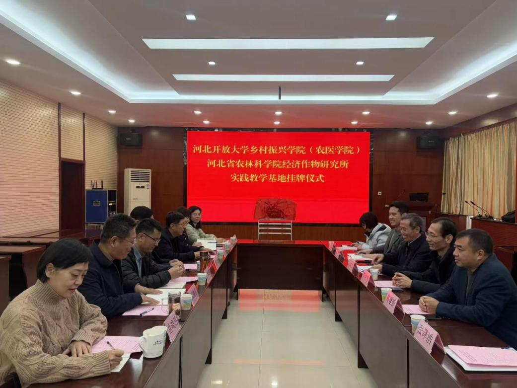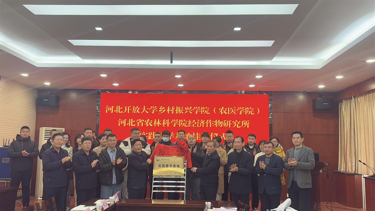 为深入贯彻党的二十届四中全会精神、探索教育强国战略与乡村振兴战略深度融合的实践路径,培养适应社会发展需要的高素质人才,2025年12月3日,河北开放大学乡村振兴学院(农医学院)在河北省农林科学院经济作物研究所举行实践教学基地挂牌仪式。仪式由河北省农林科学院经济作物研究所副所长刘晓东主持,河北开放大学乡村振兴学院(农医学院)院长白增立、副院长杜志刚、教务处副处长李培学、继续教育学院(特殊教育学院)副院长高建新,河北省农林科学院经济作物研究所书记阎立波、副所长严立斌、刘晓东、成果转化部副部长王学清等领导、专家团队及20多名学生代表齐聚一堂,共同见证。