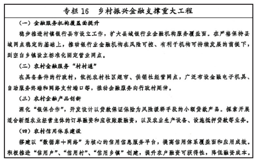 发展乡村普惠金融。深入推进银行业金融机构专业化体制机制建设,形成多样化农村金融服务主体。指导大型商业银行立足普惠金融事业部等专营机制建设,完善专业化的“三农”金融服务供给机制。完善中国农业银行、中国邮政储蓄银行“三农”金融事业部运营体系,明确国家开发银行、中国农业发展银行在乡村振兴中的职责定位,加大对乡村振兴信贷支持。支持中小型银行优化网点渠道建设,下沉服务重心。推动农村信用社省联社改革,保持农村信用社县域法人地位和数量总体稳定,完善村镇银行准入条件。引导农民合作金融健康有序发展。鼓励证券、保险、担保、基金、期货、租赁、信托等金融资源聚焦服务乡村振兴。