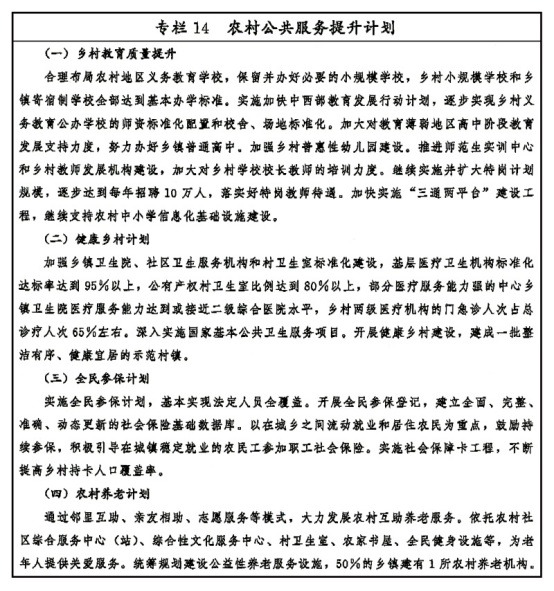 继续把国家社会事业发展的重点放在农村,促进公共教育、医疗卫生、社会保障等资源向农村倾斜,逐步建立健全全民覆盖、普惠共享、城乡一体的基本公共服务体系,推进城乡基本公共服务均等化。