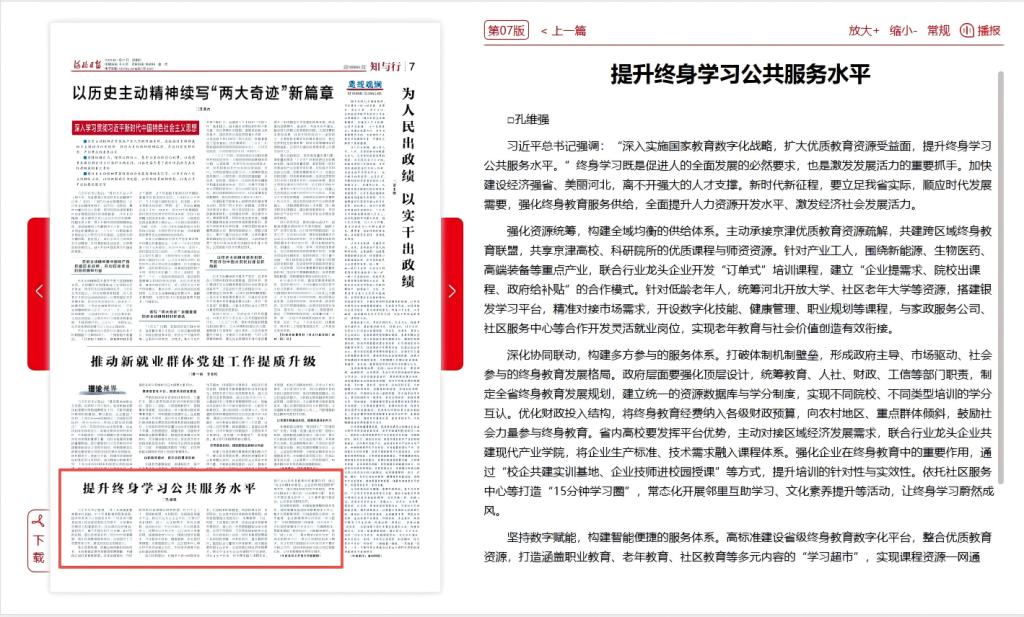 2026年1月21日,《河北日报》“知与行”专栏刊发我校马克思主义教研部孔维强副教授撰写的《提升终身学习公共服务水平》文章。